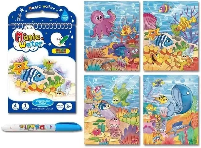 Odkryj fascynujący podwodny świat dzięki innowacyjnej magicznej książeczce wodnej! Ten wyjątkowy zestaw do malowania zapewnia godziny kreatywnej zabawy bez użycia farb czy kredek, eliminując wszelki bałagan. Idealny dla dzieci w wieku 3 lat i starszych, rozwija zdolności manualne i wyobraźnię. Zasada działania jest niezwykle prosta i magiczna: wystarczy napełnić dołączony pisak czystą wodą. Po pociągnięciu nim po specjalnych stronach, niczym za dotknięciem czarodziejskiej różdżki, ukazują się pełne barw ilustracje przedstawiające urocze morskie stworzenia i podwodną florę. Gdy woda wyschnie, kolory w magiczny sposób znikają, dzięki czemu książeczkę można używać wielokrotnie - to prawdziwa oszczędność i ekologiczne rozwiązanie! Zestaw zawiera jedną książeczkę wodną oraz jeden pisak, zapewniając gotowość do zabawy od razu po rozpakowaniu. To doskonały pomysł na prezent, który zachwyci każdego małego artystę i zapewni mnóstwo radości podczas podróży, w domu czy u przyjaciół. Przygotuj się na niezapomniane podwodne przygody!