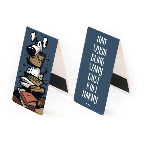 Zakładka do książek dla tych co mają wysublimowany smak i pożerają książki! Zaokrąglone rogi, papier kreda 350 g, folia zabezpieczająca błysk, folia magnetyczna na kawałku zakładki