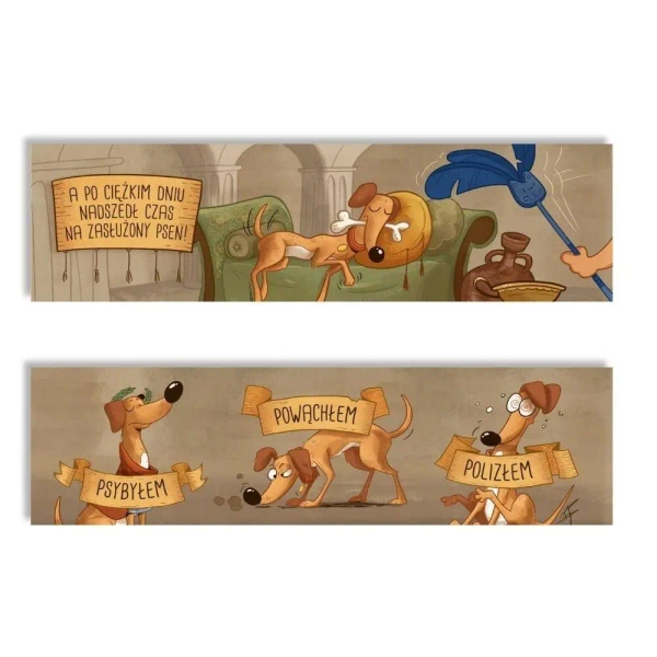 Zakładka do książek dla wszystkich, którzy kochają psy, pieski i pieseły! Psybyłem. Powąchłem. Polizłem. Czyż nie jest to idealny dzień z życia psa? Karton ozdobny perłowy 300g, sztywny, metaliczno-srebrny połysk Wymiary: 50x200mm