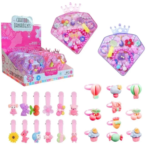 Zestaw Akcesoriów do Włosów i Pierścionków "Cartoon Ornaments" - Diamentowa Kasetka z Biżuterią dla Małej Damy! Przedstawiamy fantastyczny zestaw "Cartoon Ornaments", który sprawi, że każda dziewczynka poczuje się jak prawdziwa księżniczka! Ten uroczy komplet akcesoriów do włosów i pierścionków, zapakowany w błyszczącą kasetkę w kształcie diamentu z koroną, to idealny prezent dla małych miłośniczek mody i piękności. Główne cechy produktu: Efektowne opakowanie: Zestaw zapakowany jest w przezroczystą, brokatową kasetkę w kształcie diamentu, zwieńczoną koroną. To pudełko samo w sobie jest śliczne i może służyć do przechowywania innych skarbów. Dostępne są różne kolory kasetek (np. różowy, fioletowy). Bogactwo akcesoriów: W środku kasetki znajduje się różnorodna biżuteria: o Spinki do włosów: Klipsy do włosów z uroczymi, kolorowymi motywami, takimi jak: kwiatki, truskawki, misie "LOVE", króliczki, kokardki, kwiatek z pszczółką, czy małe laleczki. Spinki są łatwe w użyciu i dodają fryzurze uroku. o Pierścionki: Kilkanaście pierścionków z kolorowymi, zabawnymi motywami, m.in.: babeczki, wisienki, baloniki, misie Hello Kitty, słodycze, co pozwala na dopasowanie do różnych stylizacji i nastrojów. Rozwija kreatywność i styl: Zestaw zachęca do eksperymentowania z fryzurami i stylizacjami, rozwijając wyobraźnię i poczucie estetyki u dziecka. Idealny na prezent: Atrakcyjne opakowanie i różnorodność akcesoriów sprawiają, że zestaw jest doskonałym pomysłem na urodziny, imieniny, Dzień Dziecka, czy jako nagroda. Wiele do kolekcjonowania: Dostępność różnych wzorów spinek i pierścionków (widoczne na displayu zbiorczym) zachęca do kolekcjonowania całej serii "Cartoon Ornaments". Bezpieczne dla dzieci: Akcesoria wykonane są z bezpiecznych materiałów, odpowiednich dla dzieci. Zalecany wiek: 3+ (zgodnie z oznaczeniem na opakowaniu, z uwagi na małe elementy). Wielkość 11x12x6 cm Podaruj swojej małej księżniczce ten czarujący zestaw "Cartoon Ornaments" i pozwól jej błyszczeć każdego dnia!