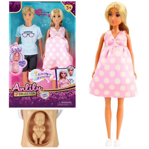 Rodzina AnLili "Family Series" - Lalka Mama z Brzuszkiem, Tata i Bobas w Zestawie! Przedstawiamy uroczy zestaw lalek AnLili z serii "Family Series", który w piękny sposób odzwierciedla radość z powiększania rodziny! To idealna zabawka edukacyjna dla dzieci, która pozwala na poznanie procesu narodzin i rozwijanie empatii, opiekuńczości oraz zrozumienia ról rodzicielskich. Główne cechy produktu: Lalka Mama z obrotowym brzuszkiem: Lalka ma długie, blond włosy i ubrana jest w uroczą, różową sukienkę w białe kropki. Jej specjalny, obrotowy brzuszek ("Belly can rotate") pozwala na umieszczenie w nim figurki bobaska. Dziecko może "wyjmować" i "wkładać" dziecko, naśladując proces narodzin, co jest zarówno edukacyjne, jak i fascynujące. Figurka bobaska: W zestawie znajduje się mała figurka bobaska, którą można umieścić w brzuszku lalki Mamy. Lalka Tata: Do zestawu dołączony jest lalka Tata z blond włosami, ubrana w jasnoniebieski T-shirt z napisem "SUMMER" i krótkie spodenki. Razem tworzą pełną rodzinę. "Welcome Baby" - powitanie bobasa: Na opakowaniu widnieje hasło "Welcome Baby", co podkreśla główny motyw zestawu i celebruje narodziny. Rozwija empatię i odpowiedzialność: Zabawa tym zestawem uczy dzieci o cyklu życia, rolach rodzicielskich, wzajemnej opiece i odpowiedzialności związanej z posiadaniem dziecka. Pobudza wyobraźnię: Dzieci mogą odgrywać różnorodne scenki rodzinne, tworzyć własne historie o życiu rodzinnym, co stymuluje kreatywność i rozwój emocjonalny. Estetyczne opakowanie: Lalki są zapakowane w eleganckie, przezroczyste pudełko z atrakcyjną grafiką, które prezentuje ich wygląd i funkcje, co czyni je doskonałym prezentem. Bezpieczne dla dzieci: Produkt wykonany jest z bezpiecznych materiałów. Zalecany wiek: 3+ (zgodnie z oznaczeniem na opakowaniu). Wielkość opakowania: 32x20x6 cm Podaruj dziecku zestaw Rodziny AnLili i pozwól mu na twórczą, edukacyjną i pełną miłości zabawę, która rozwija zrozumienie i czułość wobec rodziny.