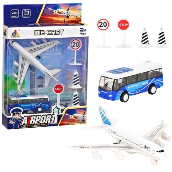 Zestaw Lotniskowy : Samolot, Autobus i Akcesoria - Podniebne Przygody Czekają! Zapraszamy do świata lotniczych przygód z naszym fantastycznym zestawem lotniskowym! Ten kompletny zestaw pozwoli każdemu małemu miłośnikowi lotnictwa stworzyć własne, realistyczne scenariusze na płycie lotniska, rozwijając wyobraźnię i pasję do podróży. Co zawiera nasz zestaw i dlaczego jest wyjątkowy? Realistyczny Samolot : Główną atrakcją zestawu jest szczegółowo wykonany model samolotu pasażerskiego w kolorze białym z niebieskimi akcentami, sygnowany "AIR". Wykonany częściowo z metalu , jest solidny i odporny na dziecięce zabawy, co zapewnia długie godziny lotów. Autobus Lotniskowy: Nieodłącznym elementem każdego lotniska jest autobus! W zestawie znajdziesz niebiesko-biały autobus lotniskowy z napisem "AIRPORT BUS", który umożliwi przewożenie pasażerów z terminala na płytę i z powrotem. Akcesoria Lotniskowe: Aby zabawa była jeszcze bardziej realistyczna, dołączono elementy infrastruktury lotniskowej: o Znaki drogowe: "STOP" i ograniczenie prędkości "20" (MPH/KM/H). o Pachołki drogowe: Dwa w czarno-białe pasy, idealne do wyznaczania stref ruchu lub parkingów. Te detale pozwalają na stworzenie prawdziwego, funkcjonującego mini-lotniska. Rozwija Wyobraźnię i Kreatywność: Zestaw inspiruje do odgrywania ról, tworzenia własnych historii o podróżach, lotach i pracy na lotnisku. Dziecko może być pilotem, kontrolerem lotów, kierowcą autobusu czy obsługą naziemną. Wspiera Rozwój Manualny: Manipulowanie pojazdami i akcesoriami rozwija precyzję ruchów, koordynację ręka-oko oraz zdolności manualne. Idealny na Prezent: To doskonały prezent dla każdego małego fana samolotów, pojazdów i podróży, idealny na urodziny, święta czy inne okazje. Opakowanie z okienkiem pięknie eksponuje zawartość. Wielkość opakowania : 18x22x5 Wiek: Odpowiedni dla dzieci w wieku 3 lata+ (zgodnie z opakowaniem). Rozpocznij swoją lotniczą przygodę! Pozwól swojemu dziecku wzbić się w powietrze z tym wspaniałym zestawem lotniskowym. To gwarancja fascynującej, edukacyjnej i kreatywnej zabawy! W zestawie: 1x Samolot pasażerski Die-Cast 1x Autobus lotniskowy 2x Znaki drogowe 2x Pachołki drogowe Przygotuj pas startowy! Zamów zestaw lotniskowy już dziś i wyrusz w podróż do krainy wyobraźni!