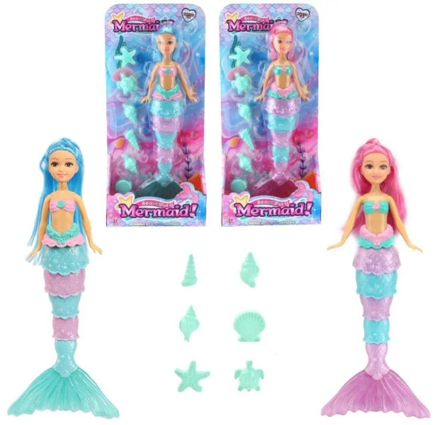 Syrenka AnLily "Beauty Mermaid" - Magiczna Lalka z Długimi Włosami i Morskimi Akcesoriami! Przenieś swoje dziecko w zaczarowany, podwodny świat z tą śliczną lalką syrenką AnLily z serii "Beauty Mermaid"! To idealna zabawka dla małych marzycielek, które uwielbiają bajki o syrenach i fantastyczne przygody. Główne cechy produktu: Uroczy design syrenki: Lalka posiada piękny ogon syreny w pastelowych, gradientowych kolorach, np. błękitno-różowo-fioletowy lub turkusowo-różowo-fioletowy. Górna część stroju to ozdobny stanik z muszelek. Długie, kolorowe włosy: Lalki mają długie, jedwabiste włosy w żywych kolorach - niebieskim lub różowym, idealne do czesania i stylizowania. Akcesoria morskie: Do zestawu dołączone są różnorodne akcesoria inspirowane podwodnym światem, takie jak rozgwiazda, muszelki (ślimak, małż), mały żółw morski. Dziecko może używać ich do tworzenia scenek i opowiadania historii. Wspiera kreatywną zabawę: Lalka syrenka idealnie nadaje się do odgrywania ról, tworzenia własnych podwodnych opowieści i rozwijania wyobraźni. Dostępne różne warianty: Na zdjęciu widoczne są dwie wersje lalek - jedna z niebieskimi włosami i druga z różowymi, co pozwala na wybór ulubionego koloru lub zebranie całej kolekcji. Estetyczne opakowanie: Lalka jest zapakowana na przezroczystym blistrze z grafiką morskich motywów i nazwą "Beauty Mermaid!", co czyni ją atrakcyjnym prezentem. Bezpieczne dla dzieci: Produkt wykonany jest z bezpiecznych materiałów. Zalecany wiek: 3+ (zgodnie z oznaczeniem na opakowaniu). Wielkość opakowania: 39x17x5 cm Podaruj swojemu dziecku tę magiczną lalkę syrenkę AnLily i pozwól mu zanurkować w świat fantazji!