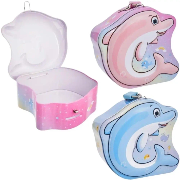Magiczna Skarbonka Delfin z Kłódką - Płyń po Marzenia i Oszczędzaj jak Rybka! Zanurz się w podwodny świat oszczędzania z naszą uroczą metalową skarbonką w kształcie uśmiechniętego delfina! To idealny sposób, aby zachęcić dzieci do zbierania pieniędzy w zabawny, bezpieczny i pełen fantazji sposób. Skarbonka, zamykana na kłódkę, stanie się strażnikiem wszystkich małych skarbów! Dostępne Kolorowe Wzory: Bajkowy Różowo-Fioletowy Delfin: Z uśmiechniętym delfinem w otoczeniu tęcz, małych rybek i magicznych bąbelków - idealny dla miłośniczek podwodnych baśni. Spokojny Błękitny Delfin: Klasyczny błękit oceanu z radosnym delfinem i towarzyszącymi mu morskimi stworzeniami - dla małych odkrywców głębin. Cechy produktu: Edukacja i Zabawa: Skarbonka w kształcie sympatycznego delfina zachęca dzieci do regularnego odkładania pieniędzy, ucząc ich wartości oszczędzania i cierpliwości. Bezpieczne Oszczędności: Wyposażona w solidną kłódkę z kluczykiem, która zapewnia bezpieczeństwo zgromadzonych monet i banknotów, dając dziecku poczucie, że jego skarby są chronione niczym cenne perły. Wytrzymała Konstrukcja: Wykonana z wysokiej jakości metalu, skarbonka jest odporna na uszkodzenia i zapewni długotrwałe użytkowanie. Uroczy Design: Kolorowe grafiki z uśmiechniętym delfinem i morskimi motywami sprawiają, że skarbonka jest niezwykle atrakcyjna wizualnie i wspaniale ozdobi każdy dziecięcy pokój. Kompaktowy Rozmiar: Idealna do postawienia na biurku, półce czy szafce nocnej. Idealny na Prezent: Wspaniały pomysł na urodziny, Dzień Dziecka, Mikołajki lub inną okazję. To praktyczny, edukacyjny i jednocześnie niezwykle uroczy upominek, który z pewnością wywoła radość. Specyfikacja: Materiał: Metal System zamykania: Kłódka z kluczykiem Dostępne wzory: Różowo-fioletowy delfin, Niebieski delfin Wymiary: 14x13x6 Wybierz magicznego delfina i podaruj dziecku skarbonkę, która zamieni oszczędzanie w fascynującą podwodną przygodę!