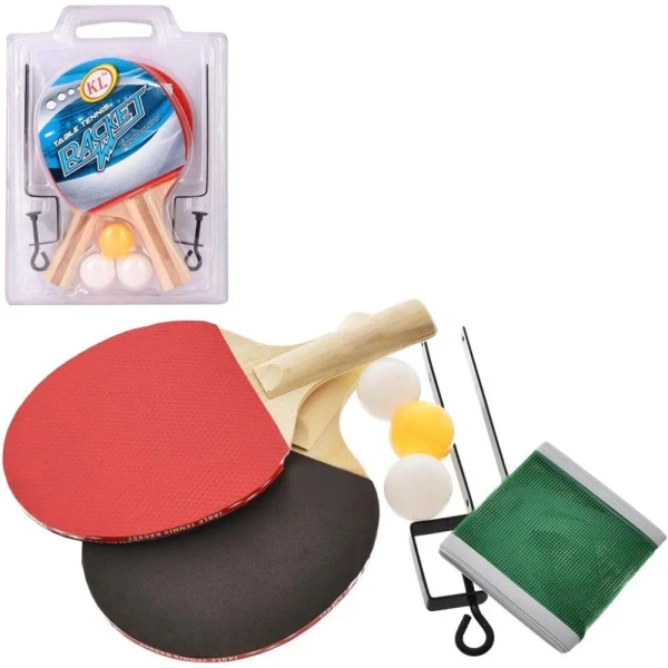 Prezentowany tu zestaw to kompletne wyposażenie, które pozwoli Ci cieszyć się grą w ping-ponga. Składa się on z dwóch rakietek oraz siatki, a także piłek. Rakietki zostały stworzone z gładkiego drewna i są bardzo wygodne w trzymaniu. Ich uchwyty świetnie dopasowują się do dłoni, zapewniając komfort podczas gry. Unikalna powierzchnia rakietek, pokryta specjalnym materiałem, gwarantuje doskonałe odbicia piłki. Co ciekawe, jedna strona rakietki jest w kolorze czerwonym, a druga czarnym.