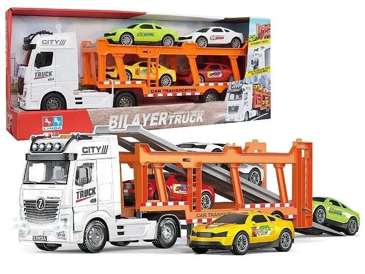 auto z lawetą 2 poziomową i 4 autami, 56x20x10,5cm; 60x14x26cm, W/B