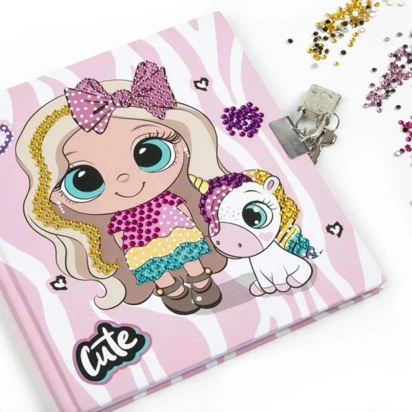 Zestaw to pełen magii komplet, składający się z pamiętnika, trójkolorowego długopisu (czarny, czerwony, niebieski), rylca z plastiku do przyklejania diamentów, wosku, podkładki oraz ponad pół tysiąca diamentów dostępnych w pięciu odcieniach.