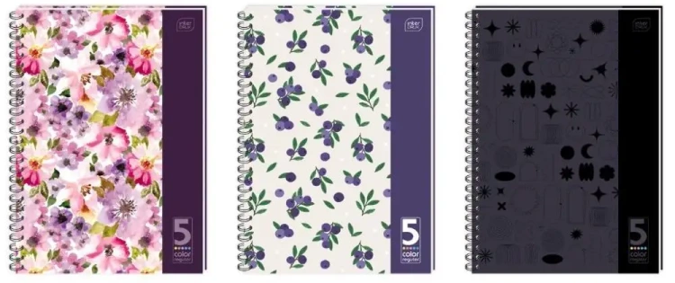 Format: B5. Liczba kartek: 160. Zadruk w kratkę. Ostre rogi. Podwójna spirala zamykana. Otwory do segregatora. Perforacja wzdłuż grzbietu, ułatwiająca wyrywanie kartek. Spirala po długim boku. W środku 5 kolorowych, wycinanych registrów.