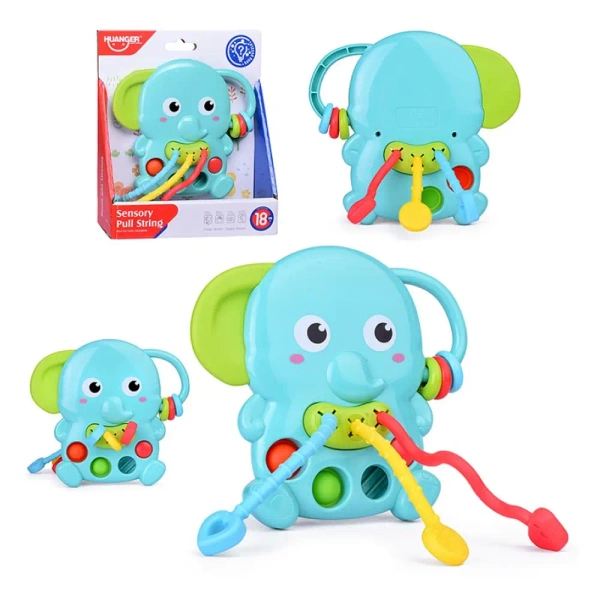 Słonik - sensoryczna przeciąganka Silikonowe, kolorowe sznurki do przeciągania, elementy typu Pop-it do stymulacji paluszków, uszko-gryzak Wymiary produktu: 15 x 17 x 13.8 cm Wymiary opakowania: 17 x 5 x 19 cm Wiek 18m+