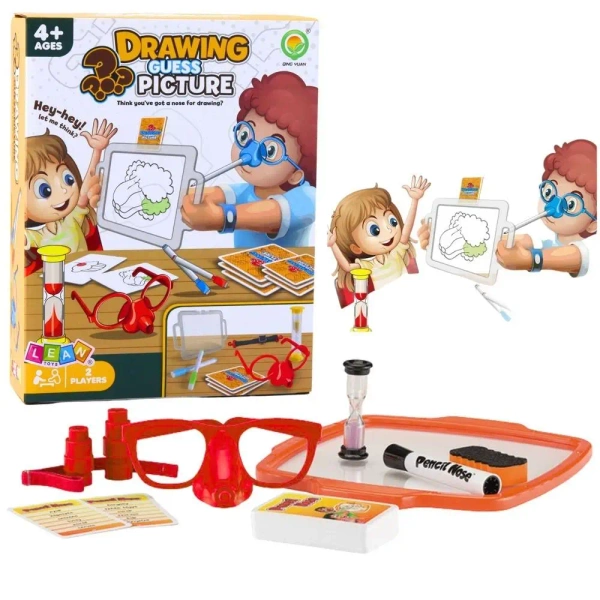 GRA NARYSUJ I ZGADNIJ OBRAZEK - MALOWANIE NOSEM Narysuj i Zgadnij Obrazek to przezabawna i kreatywna gra rodzinna, która pozwala graczom rysować nosem! Dzięki specjalnym okularom z uchwytem na marker, rysowanie staje się nie lada wyzwaniem i źródłem ogromnej dawki śmiechu. Gra łączy w sobie elementy kalamburów, rysowania i rywalizacji drużynowej - idealna na imprezy, spotkania rodzinne czy wspólną zabawę z dziećmi. Zadaniem gracza jest narysowanie hasła z karty przy pomocy specjalnych okularów - marker zamocowany w ramce służy jako "nos", którym malujemy na przezroczystej tablicy. Pozostali gracze muszą jak najszybciej odgadnąć, co przedstawia rysunek. Czas ogranicza klepsydra, więc liczy się refleks, wyobraźnia i współpraca. Gra została zaprojektowana z myślą o dzieciach od 4 roku życia, jednak bawi zarówno najmłodszych, jak i dorosłych. Zestaw zawiera 54 karty z hasłami i wszystkie akcesoria potrzebne do gry. Dodatkowym atutem jest możliwość tworzenia własnych haseł, dzięki czemu zabawa nigdy się nie nudzi! SPECYFIKACJA: Rodzaj gry: kreatywna gra drużynowa - rysowanie nosem Liczba graczy: 2 lub więcej (gra drużynowa) Tryb gry: na hasła z kart lub wymyślone przez graczy Czas jednej rundy: odliczany przez klepsydrę Cel gry: narysować obrazek nosem i odgadnąć jak najwięcej haseł Wymiary opakowania: 27 x 21 x 6,5 cm Materiał: tworzywo sztuczne, plastik, papier ZAWARTOŚĆ ZESTAWU: 2 x okulary z miejscem na marker 2 x marker (niebieski i zielony) z końcówką do ścierania 1 x przezroczysta tablica do rysowania 54 x karty z hasłami 1 x klepsydra 2 x opaski na rękę