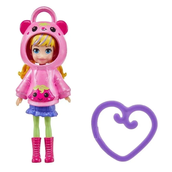 Teraz możesz łatwo zabrać ze sobą lalki Polly Pocket i jej przyjaciół, gdziekolwiek chcesz, dzięki specjalnym klipsom, które można przyczepić do plecaka, paska i w innych wygodnych miejscach. Każda z tych lalek (7,5 cm) ma bluzę ze zwierzącym motywem oraz haczykiem, który można przyczepić do dołączonego serduszkowego klipsa, aby zawsze mieć lalkę przy sobie. Zdejmowany strój obejmuje bluzę z kapturem, kolorowe spodnie/spódniczkę i buciki. Zbierz je wszystkie, aby dowolnie łączyć elementy.
