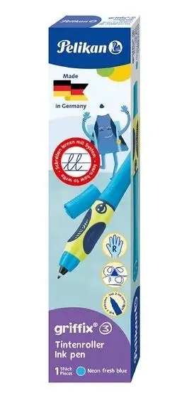 Pióro kulkowe Pelikan Griffix to etap 3 w 4-stopniowym systemie nauki pisania stworzonym przez markę Pelikan. Po opanowaniu rysowania kredkami i pisania ołówkiem, dziecko jest gotowe na kolejny krok rozpoczęcie nauki pisania piórem. Na tym etapie dzieci nadal doskonalą chwyt szczypcowy, a jednocześnie zaczynają przyzwyczajać się do korzystania z narzędzia piśmienniczego z płynnym atramentem. Ponieważ młodsze dzieci mają tendencję do silniejszego naciskania na papier, pióro zostało wyposażone w specjalną końcówkę, która amortyzuje nacisk i umożliwia miękkie, płynne pisanie bez oporu. Widoczna uśmiechnięta buźka na korpusie podpowiada dziecku, że trzyma pióro prawidłowo. Ergonomiczny, trójkątny uchwyt pokryty został gumowaną powierzchnią, dzięki czemu dłoń się nie ślizga, a dziecko uczy się pisać w sposób wygodny i naturalny. Pióro działa na naboje atramentowe kulkowe, co czyni je czystym i łatwym w obsłudze.