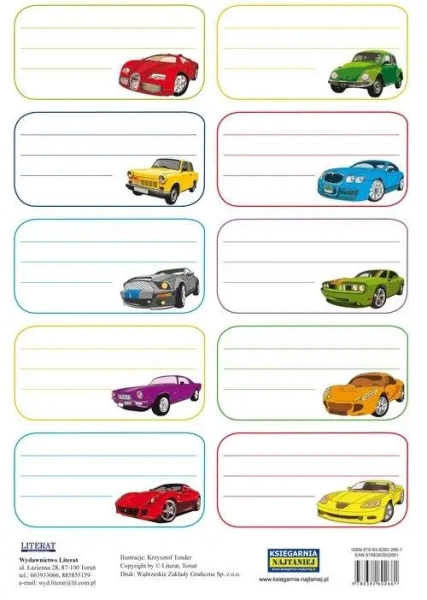 Prezentowany zestaw zawiera 10 naklejek z rysunkami samochodów, z przeznaczeniem do oznaczania zeszytów i książek. Każda naklejka posiada również miejsce na dokładny opis użyteczny przy identyfikacji zawartości zeszytu czy książki. Ciekawe grafiki z samochodami umilą dzieciom przyjemność z nauki i zachęcą do dbałości o porządek w swoich zeszytach oraz książkach.EAN: 9788382602661