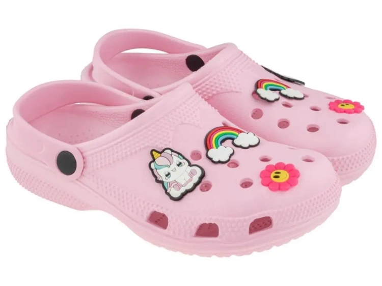 Urocze clogi dziewczęce w kolorze różowym to idealne obuwie na lato - sprawdzą się zarówno w domu, jak i na zewnątrz, np. w ogrodzie, na plaży czy podczas wakacyjnych wyjazdów. Model został ozdobiony gumowymi pinami w kształcie jednorożca, tęczy i kwiatka - po trzy na każdego cloga. Piny można dowolnie przekładać i umieszczać w otworach wentylacyjnych, co daje dziecku możliwość personalizacji i zabawy wyglądem obuwia. Clogi wykonane są z miękkiego, lekkiego i elastycznego tworzywa EVA, które zapewnia wysoki komfort noszenia, jest łatwe w czyszczeniu i odporne na wilgoć. Dzięki swojej lekkości buty nie męczą stopy nawet po wielu godzinach noszenia. Dodatkowo model wyposażony został w ruchomy pasek na piętę, który można przełożyć do przodu lub zostawić z tyłu - co pomaga utrzymać stopę we właściwym miejscu i zwiększa stabilność podczas chodzenia. Długość wkładki: 19,5 cm