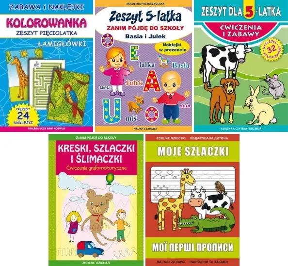 Doskonałe połączenie nauki i zabawy dla pięciolatków – dzieci rozwiązują różnorodne zadania edukacyjne, kolorują obrazki i wklejają naklejki we właściwe miejsca. Dodatkowe atuty tej książki to duże, wyraźne ilustracje z grubymi konturami i tematyka związana z edukacją przedszkolną. Polecamy również książkę „Zeszyt 5-latka. Matematyka. Basia i Julek”.