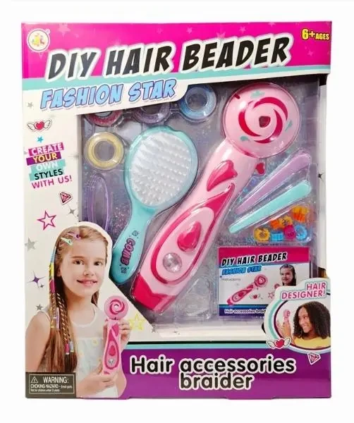 Zestaw do stylizacji włosów z zaplatarką, szczotką, spineczkami i koralikami. Zapakowany w kartonowe pudełko. Zabawka przeznaczona dla dzieci od lat 6. Podane wymiary stanowią wymiar opakowania.