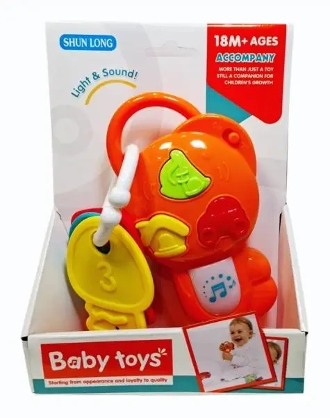 Kolorowy zestaw kluczy z dźwiękami i światłami, przeznaczony do zabawy dla najmłodszych. Zapakowany w kartonowe pudełko. Zabawka przeznaczona dla dzieci od 18 miesiąca życia. Produkt działa na baterie typu AA. Baterie nie są załączone do zabawki.