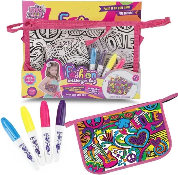 Zabawka kreatywna dla dziewczynki - stylowa torebka / saszetka do własnoręcznego pomalowania, która zachwyci każdą małą artystkę. Zestaw torebka z pisakami to idealny prezent dla dziewczynki, która lubi tworzyć własne wzory i kolory. Przednia część torby zawiera grafikę z zachowanymi konturami, którą dziecko może samodzielnie pomalować zawartymi w zestawie flamastrami. Pisaki są zmywalne wodą, więc można je używać wielokrotnie i zmieniać wygląd torebki według nastroju i pomysłów. Torebka ma dwoje uszu dzięki czemu możemy ją nosić na ręce jak i również nosić ze sobą drobiazgi.
