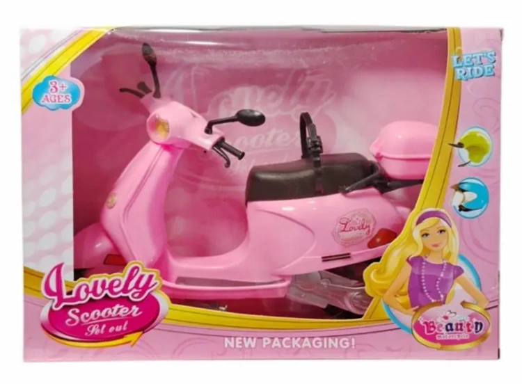 Różowy skuter dla lalki z realistycznymi detalami. Zapakowany w kartonowe pudełko. Zabawka przeznaczona dla dzieci od lat 3.