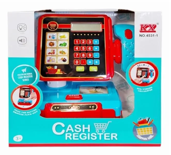 Zabawka kasa sklepowa z przyciskami, skanerem i otwieraną szufladą na pieniądze. Zawiera funkcję kalkulatora. Kasa wydaje dźwięki. Zapakowana w kartonowe pudełko. Zabawka przeznaczona dla dzieci od lat 3. Podane wymiary stanowią wymiar opakowania.