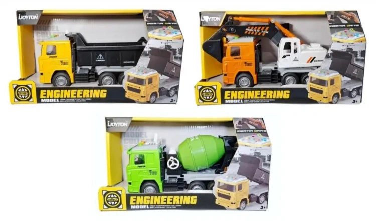 Zestaw pojazdów budowlanych: wywrotka, betoniarka lub koparka. Każdy pojazd posiada ruchome elementy. Pozatym pojazdy świecą kolorowymi światełkami, wydają dźwięki (np. syrena alarmowa, odpalania silnika) i grają melodie. Zapakowane w kartonowe pudełka. Zabawka przeznaczona dla dzieci od lat 3. Zabawka działa na baterie typu AG13. Baterie znajdują się w zabawce.