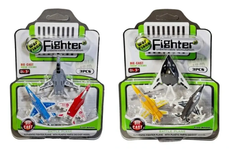 Zestaw 3 metalowych samolotów myśliwskich z elementami plastikowymi. Zapakowany na blistrze. Zabawka przeznaczona dla dzieci od lat 3. Podane wymiary stanowią wymiar opakowania.