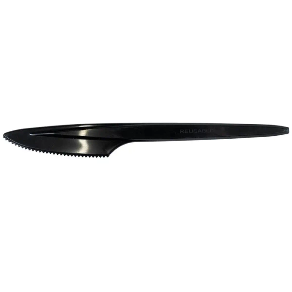 Noże wielorazowe z wytrzymałego tworzywa. 100 sztuk. Czarne wielorazowe noże łączą trwałość, lekkość i wygodę użytkowania. Wykonane z tworzywa sztucznego, stanowią praktyczne rozwiązanie podczas organizacji przyjęć i spotkań plenerowych. Cechy produktu: - solidne i lekkie - wykonane z wytrzymałego materiału, odporne na złamania, wygodne w użytkowaniu, - wielokrotnego użytku - możliwość mycia w zmywarce nawet 125 razy, co czyni je doskonałą alternatywą dla jednorazowych sztućców, - funkcjonalna budowa - ostrze ząbkowane umożliwia łatwe krojenie różnorodnych potraw, - estetyczny wygląd - czarny kolor sprawdzi się zarówno na codziennym stole, jak i podczas innych okazji, - uniwersalne zastosowanie - idealne na grill, garden party, pikniki, imprezy plenerowe oraz przyjęcia okolicznościowe. Dane techniczne: - długość noża: 18 cm, - materiał: tworzywo sztuczne wielokrotnego użytku, - kolor: czarny, - ilość w opakowaniu: 100 sztuk.