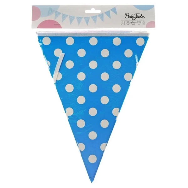 Girlanda papierowa trójkątna niebieska w kropki. Idealna na urodziny lub baby shower. Długość: 220 cm