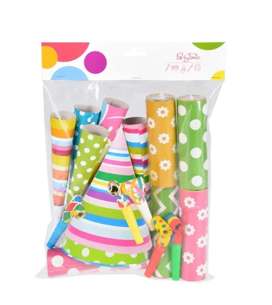 Zestaw imprezowy dla dziesięciu osób na bal sylwestrowy, karnawałowy, urodziny, kinderbal. W skład zestawu wchodzi 10 papierowych czapeczek z gumeczką, 5 trąbek, 5 gwizdków oraz 5 serpentyn. Kolorowy zestaw uniwersalny. Gadżety imprezowe o wymiarach: czapeczka 16 cm wys. o średnicy 10 cm, trąbka 19 cm, gwizdek 9 cm (rozwinięty 2,5x35 cm), serpentyny - 18 krążków w jednym słupku.