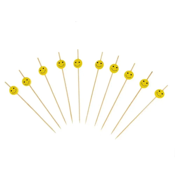 Wykałaczki zakończone dekoracyjnymi kształtami ze wzorem uśmiechniętej buzi. Idealne do koreczków wytrawnych jak i słodkich, jako dekoracja ciast, muffinów, owoców. Dekoracyjne wykończenie patyczków nadaje potrawom ciekawego wyglądu. Produkt posiada certyfikat FSC(R), co oznacza, że surowce wykorzystane do jego produkcji zostały pozyskane w zgodzie z odpowiedzialnym i legalnym korzystaniem ze światowych zasobów leśnych. W opakowaniu znajduje się 10 sztuk. Szpilki o długości 12 cm.