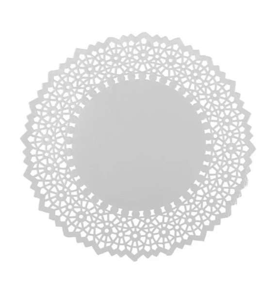 Serwetka papierowa z ażurowym brzegiem pod ciasto pakowana po 100 sztuk.