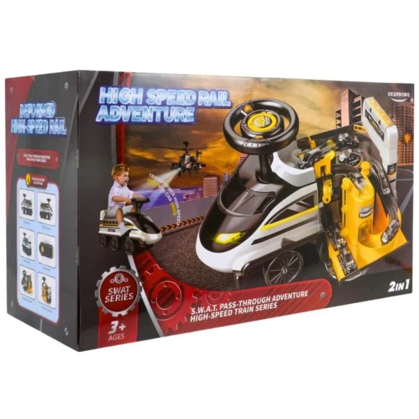 Jeździk to doskonały sposób na rozwijanie zdolności motorycznych i równowagi malucha. Wykonany z wytrzymałych materiałów, zapewnia bezpieczną zabawę zarówno w domu, jak i na zewnątrz podczas spacerów z rodzicami. Dodatkowym atutem są wysuwane podnóżki po obu bokach. Kierownica jest wyposażona w dwa guziki, dzięki którym kontrolować można efekty specjalne. Pojazd posiada 6 kół, na wzór pociągu, z czego dwa przednie są skrętne. Z tyłu jest chroniony panel z muzyką, opowiadaniami i odgłosami zwierząt (lektor nagrany w języku angielskim). Z przodu są świecące reflektory, a pod imitacją szybki - miejsce na drobiazgi. Kolejne miejsce na bagaż znajduje się pod parkingiem. Parking na samochodziki znajduje się pod siedzeniem jeździka i ma ruchome, ręcznie sterowane, elementy - winda, szlaban, podnośnik i kółko obrotowe. Do zestawu dołączone są małe autka (ok. 7 x 2,5 x 3cm), które idealnie pasują do parkingu.