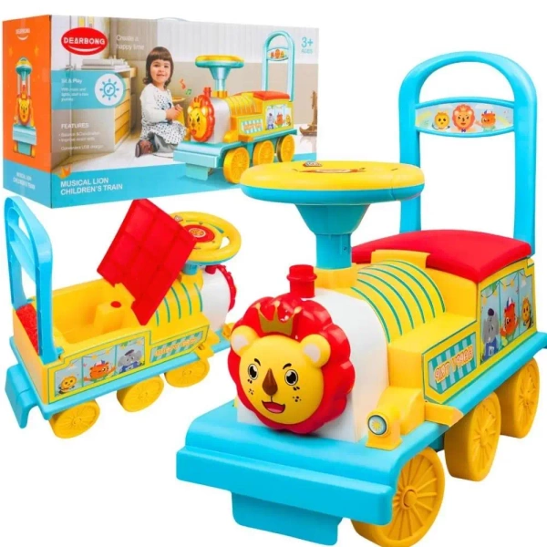 Na przodzie jeździka znajduje się design z lwem, a całość ozdobiona jest naklejkami. Jeździk imituje dźwięki prawdziwego pociągu, a kierownica świeci się na różne kolory, dzięki czemu zabawa jest jeszcze lepsza.