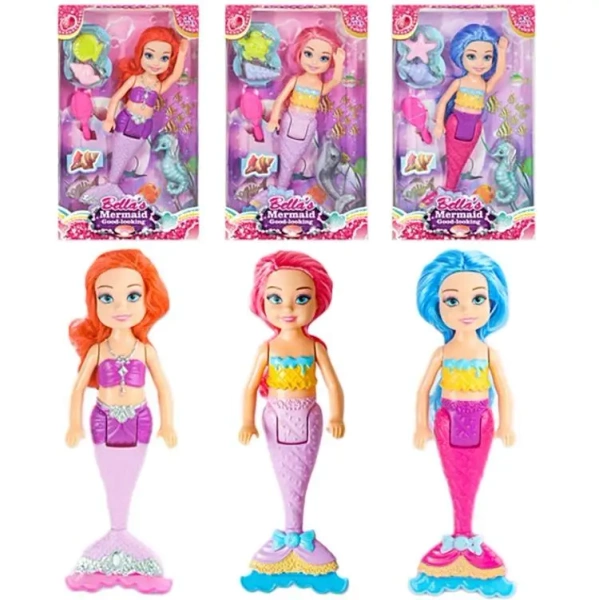 Lalka Syrenka "Bella's Mermaid" - Zanurkuj w Magiczny Świat Podwodnych Przygód! Przedstawiamy urocze lalki syrenki "Bella's Mermaid", które przeniosą Twoje dziecko w bajkowy świat podwodnych królestw! Te piękne figurki z pewnością zachwycą każdego miłośnika morskich opowieści i magicznych stworzeń. Cechy produktu: Trzy Warianty Kolorystyczne: Dostępne w trzech wersjach, każda z lalką o innej, jaskrawej fryzurze (ruda, różowa, niebieska) i dopasowanym ogonie, co pozwala na zebranie całej kolekcji i tworzenie różnorodnych podwodnych opowieści. W zestawie Akcesoria: Każda lalka syrenka zawiera dodatkowe akcesoria, takie jak grzebyk (w kształcie muszelki lub podobnym motywie morskim) oraz inne drobne elementy (np. figurka konika morskiego, muszelka, rozgwiazda - widoczne na blistrze), które urozmaicają zabawę i pozwalają na stylizację włosów lalki. Magiczny Design: Lalki posiadają urocze topy z motywami muszelek lub fal, oraz błyszczące ogony w różnych odcieniach fioletu, różu i niebieskiego, zakończone stylizowanymi płetwami, które dodają im bajkowego uroku. Rozwój Wyobraźni: Lalki syrenki inspirują do kreatywnej zabawy w odgrywanie ról, rozwijają wyobraźnię i pomagają dzieciom tworzyć własne, fantastyczne historie o życiu pod wodą. Idealne do Zabawy w Kąpieli: Ze względu na swoją tematykę i wykonanie z tworzywa sztucznego, lalki mogą być również używane do zabawy w wannie lub basenie, dodając magii każdej kąpieli. Atrakcyjne Opakowanie: Każda lalka jest zapakowana w kolorowy blister, który prezentuje lalkę i jej akcesoria, co czyni ją idealnym pomysłem na prezent. Opakowanie nawiązuje do morskiej estetyki, z motywami podwodnego świata. Wielkość opakowania: 27x16x6 cm Idealna dla: Dzieci uwielbiających syrenki i baśniowe postaci. Rozwijania wyobraźni i kreatywności. Zabawy w odgrywanie ról. Prezentu na urodziny, Dzień Dziecka czy inną okazję. Zanurz się w cudowny świat podwodnych przygód z lalką syrenką "Bella's Mermaid" i pozwól swojej wyobraźni popłynąć!