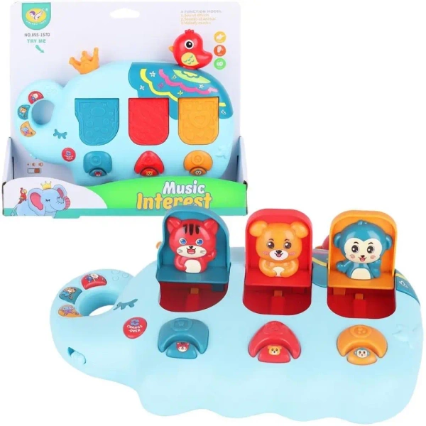 Interaktywna Zabawka Muzyczna "Music Interest" - Słonik z Wyskakującymi Zwierzątkami! Rozbudź ciekawość i rozwijaj zdolności poznawcze swojego maluszka z naszą uroczą interaktywną zabawką muzyczną "Music Interest"! Ten słodki słonik to centrum zabawy, które zachęca do odkrywania dźwięków, kształtów i kolorów, zapewniając godziny angażującej rozrywki. Cechy produktu: Interaktywne elementy: Zabawka posiada trzy kolorowe przyciski/dźwignie w kształcie grzybków, których naciśnięcie lub przesunięcie sprawia, że z odpowiednich "skrytek" wyskakują urocze figurki zwierzątek (kotek, szczeniaczek, małpka). Funkcje muzyczne i edukacyjne: o 3 tryby zabawy ("3 Function Model"): Zabawka oferuje różne tryby, które aktywują dźwięki, melodie i interakcje. o Dźwięki zwierząt ("Sounds of Animal"): Po naciśnięciu zwierzątka mogą wydawać swoje charakterystyczne dźwięki, co wspiera rozpoznawanie zwierząt. o Melodie i piosenki ("Music/Songs"): Słonik odtwarza wesołe melodie i piosenki, które bawią i rozwijają słuch muzyczny. Wesoły design: Zabawka w kształcie uśmiechniętego, niebieskiego słonika z królewską koroną i małym ptaszkiem na głowie, jest estetyczna i przyjazna dla dzieci. Kolorowe przyciski i figurki zwierzątek dodatkowo stymulują wzrok. Rozwój kluczowych umiejętności: o Motoryka mała: Naciskanie, przesuwanie i manipulowanie elementami rozwija zręczność palców i koordynację ręka-oko. o Przyczyna i skutek: Dziecko uczy się zależności między swoim działaniem a reakcją zabawki. o Rozwój sensoryczny: Dźwięki, kolory i różnorodne tekstury stymulują zmysły wzroku, słuchu i dotyku. o Kreatywność i wyobraźnia: Odgrywanie scenek ze zwierzątkami rozwija wyobraźnię. Przycisk "TRY ME!": Możliwość przetestowania funkcji zabawki bezpośrednio w opakowaniu. Bezpieczeństwo: Produkt wykonany z bezpiecznych, trwałych materiałów, przeznaczony dla najmłodszych. Zasilanie: Wymaga baterii (brak w zestawie). Wielkość opakowania: 24x21x6 cm Interaktywna zabawka "Music Interest" to doskonały wybór dla każdego maluszka, który zaczyna odkrywać świat dźwięków i interakcji. Gwarantuje wiele uśmiechu, radości i wspiera wszechstronny rozwój!