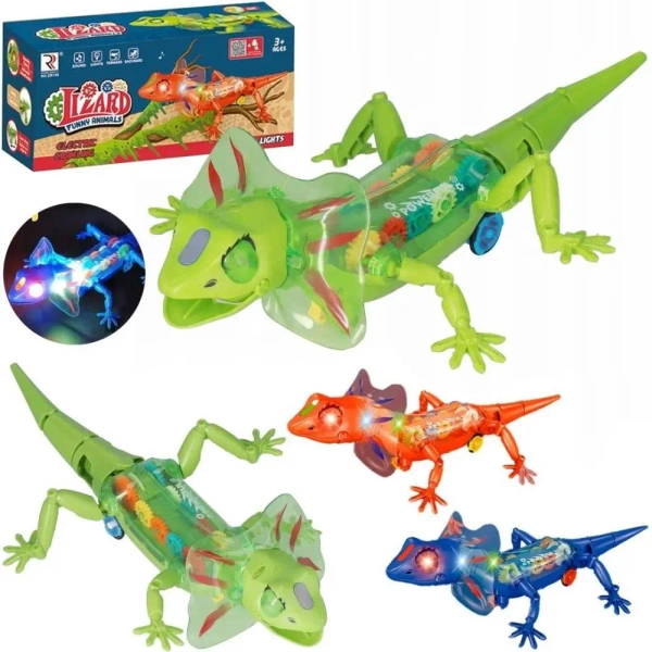 Interaktywna Jaszczurka Robot - Świecące Koła Zębate i Dynamiczny Ruch! Opis produktu: Poznaj fascynujący świat robotyki i mechaniki z naszą interaktywną jaszczurką! Ta niezwykła zabawka to idealny prezent dla małych odkrywców, którzy uwielbiają zagadki i dynamiczną zabawę. Jaszczurka łączy w sobie elementy edukacyjne z czystą frajdą. Cechy, które zachwycą: Przezroczysta obudowa: Dzięki niej dziecko może podziwiać złożony mechanizm wewnętrzny - kolorowe, obracające się koła zębate, które napędzają jaszczurkę. To świetna okazja do nauki podstaw mechaniki! Efekty świetlne: Jaszczurka świeci w wielu kolorach, szczególnie efektownie prezentując się w ciemności. Jej oczy oraz wnętrze mienią się hipnotyzującymi barwami, co dodaje zabawie magii. Dynamiczny ruch: Jaszczurka porusza się w sposób naśladujący prawdziwe zwierzę, co sprawia, że zabawa jest jeszcze bardziej realistyczna i angażująca. Dostępne kolory: Zabawka występuje w kilku atrakcyjnych kolorach (zielony, pomarańczowy, niebieski), co pozwala na wybór ulubionej wersji lub zebranie całej kolekcji. Rozwój i edukacja: Zachęca do obserwacji, stymuluje wyobraźnię i ciekawość świata, a także uczy zależności przyczynowo-skutkowych. Bezpieczeństwo: Produkt przeznaczony dla dzieci w wieku 3 lata+, co potwierdza opakowanie. Wykonana z bezpiecznych materiałów. Idealna dla: Dzieci ciekawych świata i lubiących nowości. Małych inżynierów i przyszłych naukowców. Każdego, kto szuka oryginalnej i angażującej zabawki. W zestawie: 1 x interaktywna jaszczurka (kolor wysyłany losowo lub do wyboru, w zależności od dostępności). Wielkość opakowania: 27x12x9 cm Wiek: 3 lata +