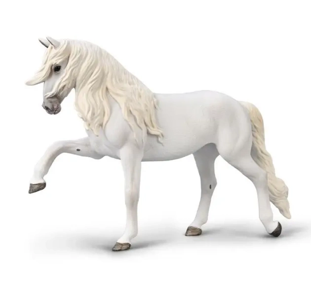 Elegancka figurka klaczy lipicańskiej w dynamicznym chodzie hiszpańskim. Realistycznie odwzorowana, z charakterystyczną siwą maścią i starannie oddanymi detalami. . Idealna do kolekcji lub jako element edukacyjny.