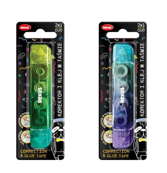 Uniwersalny produkt 2w1- korektor i klej w formie taśmy, zapewniający łatwe iwygodne korzystanie,idealny do przechowywania w piórniku. Z jednej strony narzędzia znajduje się korektor a, z drugiej klej. Idealnie kryjący korektor, po którym można pisać. Klej z szybką aplikacją, nie brudzi rąk.