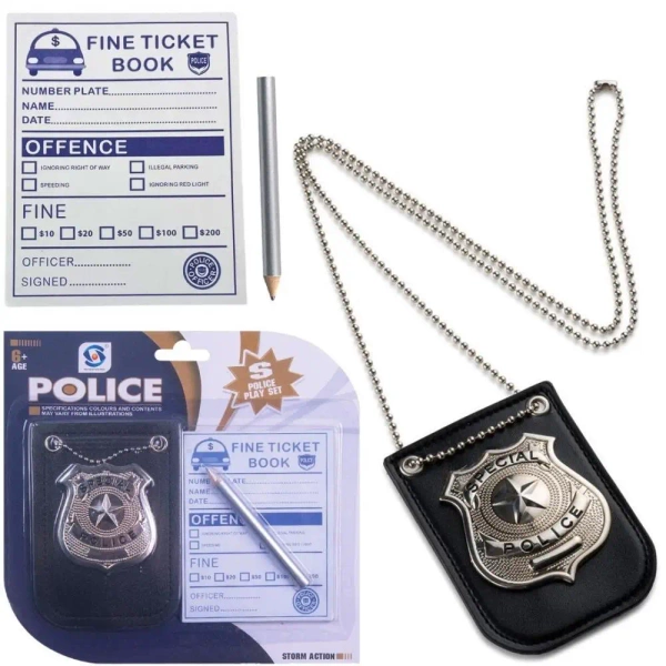 Zestaw Małego Policjanta - Odznaka i Mandaty! Wciel się w rolę prawdziwego stróża prawa dzięki temu ekscytującemu zestawowi małego policjanta! Idealny dla dzieci, które uwielbiają odgrywać role i marzą o utrzymywaniu porządku. Ten zestaw zapewni godziny kreatywnej zabawy. Główne cechy produktu: Policyjna odznaka: Realistyczna odznaka policyjna w metalicznym kolorze, umieszczona na czarnym podkładzie, z mocowaniem na łańcuszku. Dziecko może ją nosić na szyi, niczym prawdziwy funkcjonariusz. Napis "SPECIAL POLICE" dodaje autentyczności. Książeczka z mandatami: Zeszyt "FINE TICKET BOOK" z formularzami mandatów, które dziecko może wypełniać. Na formularzach znajdują się rubryki na numer rejestracyjny, imię i nazwisko, datę, a także pola do zaznaczenia rodzaju wykroczenia (np. "IGNORING RIGHT OF WAY" - ignorowanie pierwszeństwa, "ILLEGAL PARKING" - nielegalne parkowanie, "SPEEDING" - przekroczenie prędkości, "IGNORING RED LIGHT" - ignorowanie czerwonego światła). Można także wpisać kwotę "grzywny". Ołówek: W zestawie znajduje się również mały ołówek, który pozwoli na wygodne wypełnianie mandatów. Rozwija wyobraźnię: Zestaw idealnie nadaje się do odgrywania ról, rozwijania kreatywności i wymyślania scenariuszy związanych z pracą policji. Wspiera umiejętności społeczne: Dzieci mogą bawić się w grupach, ucząc się zasad i norm społecznych poprzez zabawę w egzekwowanie prawa. Idealny na prezent: Zestaw jest estetycznie zapakowany na blistrze, co sprawia, że jest gotowym i atrakcyjnym prezentem dla małych fanów służb mundurowych. Zalecany wiek: 6+ Wielość opakowania 19x20 cm Daj swojemu dziecku szansę na wspaniałą przygodę i naukę odpowiedzialności z zestawem małego policjanta!