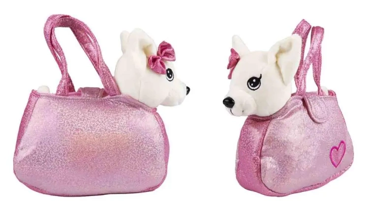 Maskotka pluszowy pies w zapinanej brokatowo-różowej torebce.