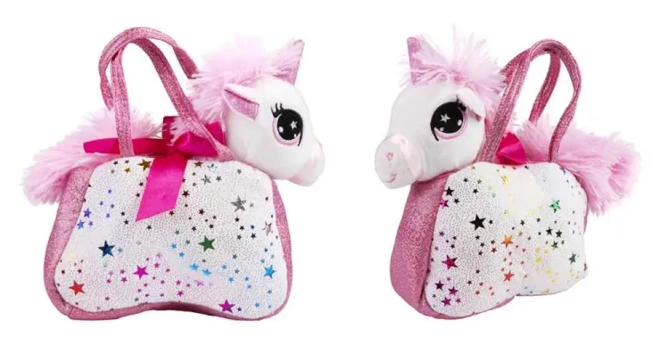 Dzięki ślicznej połyskującej torebce w gwiazdeczki, dziewczynka zabierze go dokądkolwiek zechce np. do przedszkola, na spacer i na przyjęcie do przyjaciółki. W modnej torbie z kokardką, konik ma przestrzeń i może cieszyć się wspaniałym widokiem podczas spacerów.