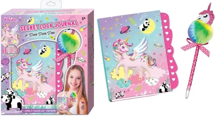 W zestawie: notes 200 stron zamykany na tajny kod, 1 ozdobny długopis jednorożec z pomponem