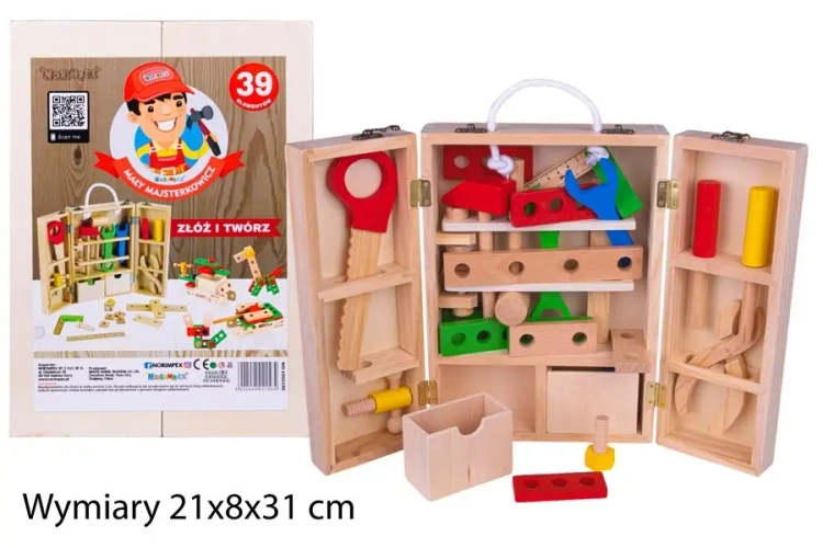 Duży zestaw drewnianych narzędzi w zamykanej drewnianej skrzynce.