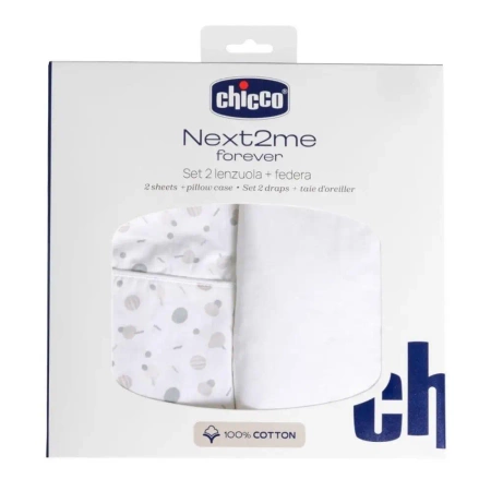 Kompletny zestaw: zawiera prześcieradło górne i dolne oraz poszewkę na poduszkę, zapewniając maksymalny komfort podczas odpoczynku. Zgodnie z wytycznymi dotyczącymi bezpiecznego snu, poduszka jest zalecana wyłącznie dla dzieci w wieku od 12 miesięcy. Miękka bawełna: prześcieradła wykonane w 100% z bawełny, delikatnego materiału idealnego dla wrażliwej skóry dziecka. Wymiary: kompatybilne z Chicco Next2Me Forever i łóżeczkami z materacem o wymiarach 58x110 cm Materiał: 100% bawełna