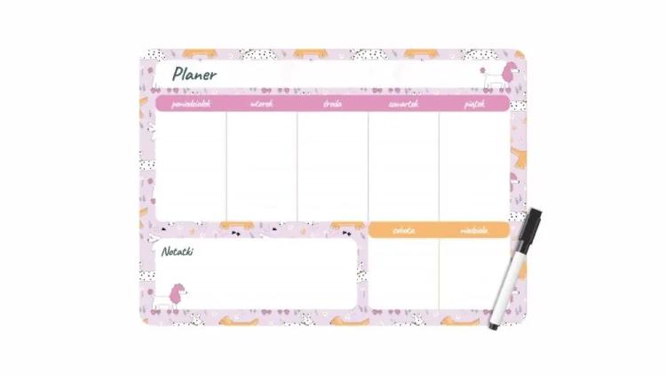 Planer na lodówkę z motywem z Kolekcji nadruków. Wyposażony w magnetyczny podkład, dzięki któremu można umieścić go na lodówce, jak i każdej innej powierzchni metalowej. Układ tygodniowy znacznie ułatwi zaplanowanie najważniejszych wydarzeń tygodnia czy też zanotowanie planu lekcji dziecka. Powierzchnia suchościeralna pozwala na wielokrotne użycie planera (zalecamy stosowanie akcesoriów do tablic suchościeralnych). Nadaje się zarówno do domu, szkoły czy biura. GRATIS dedykowany, czarny marker z magnesem i gąbką.