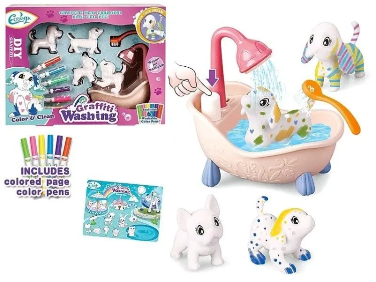 6 flamastrów zmywalnych, 4 psy, wanna z funkcją wody 32,5x12x24cm
