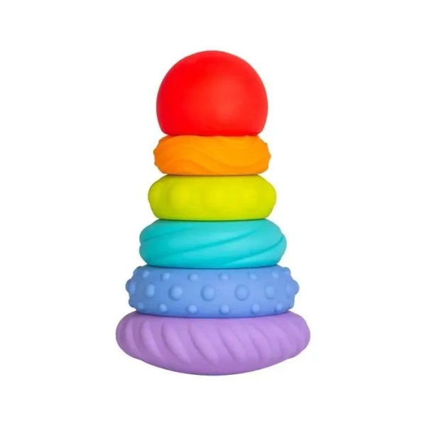 Ta sprytna zabawka balansuje, nakłada się i rozkłada co pobudza ciekawość dziecka i zachęca je do aktywnej, kreatywnej i edukacyjnej zabawy. 6 barwnych, przyciągających wzrok i będących okazją do nauki kolorów, pierścieni wykonanych w 100% z bezpiecznego silikonu spożywczego można nakładać na siebie i zdejmować. Różnorodne faktury poszczególnych pierścieni delikatnie masują dziąsła i przynoszą ulgę w trudnym okresie ząbkowania.