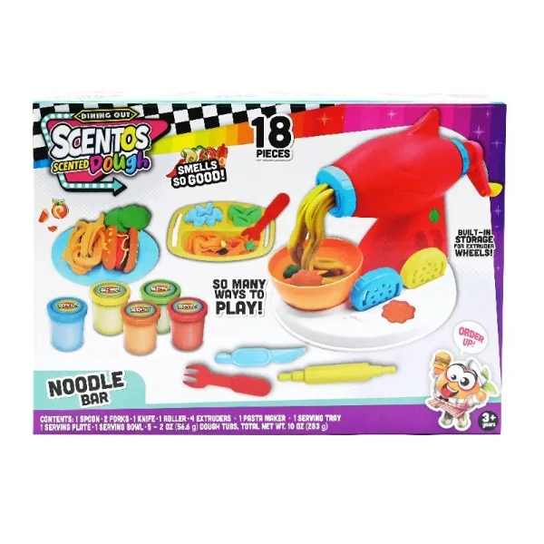 Wciel się w rolę szefa kuchni, tworząc przy użyciu zabawkowej maszynki własny, ciastolinowy makaron! W zestawie znajdują się kubeczki ze słodko pachnącą, kolorową ciastoliną, zabawkowe sztućce, zabawkowe naczynia, zabawkowy wałek oraz różne końcówki, zmieniające kształt wyciskanej ciastoliny. Na ściankach maszynki znajdują się foremki do stworzenia dodatków z ciastoliny, które urozmaicą zabawkowe danie.