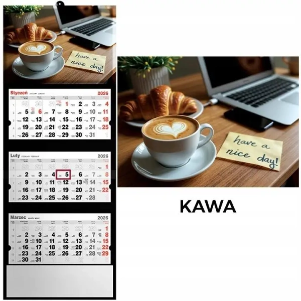 KALENDARZ TRÓJDZIELNY 2026 WYMIAR CAŁKOWITY KALENDARZA: 32 x 85,5cm GŁÓWKA KALENDARZA: Zdjęcie uszlachetniane folią błysk, z efektem wypukłości. KALENDARIUM: wym. 28,5 x 14 cm, trójjęzyczne (PL, GB, D), z numeracją tygodni i imieninami jest przytrzymywane przez kartonowe wypustki, które zapobiegają jego odstawaniu od plecków kalendarza. WYKOŃCZENIE: kartonowa zawieszka, pasek z czerwonym przesuwanym okienkiem, miejsce na notatki. WYMIAR ZDJĘCIA 32 x 22 cm ZDJĘCIE Z EFEKTEM WYPUKŁOŚCI: uszlachetnione folią błysk.