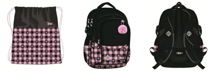 Plecak szkolny St.Right PINK CHECKERED + worek + piórnik szachowncia czarny